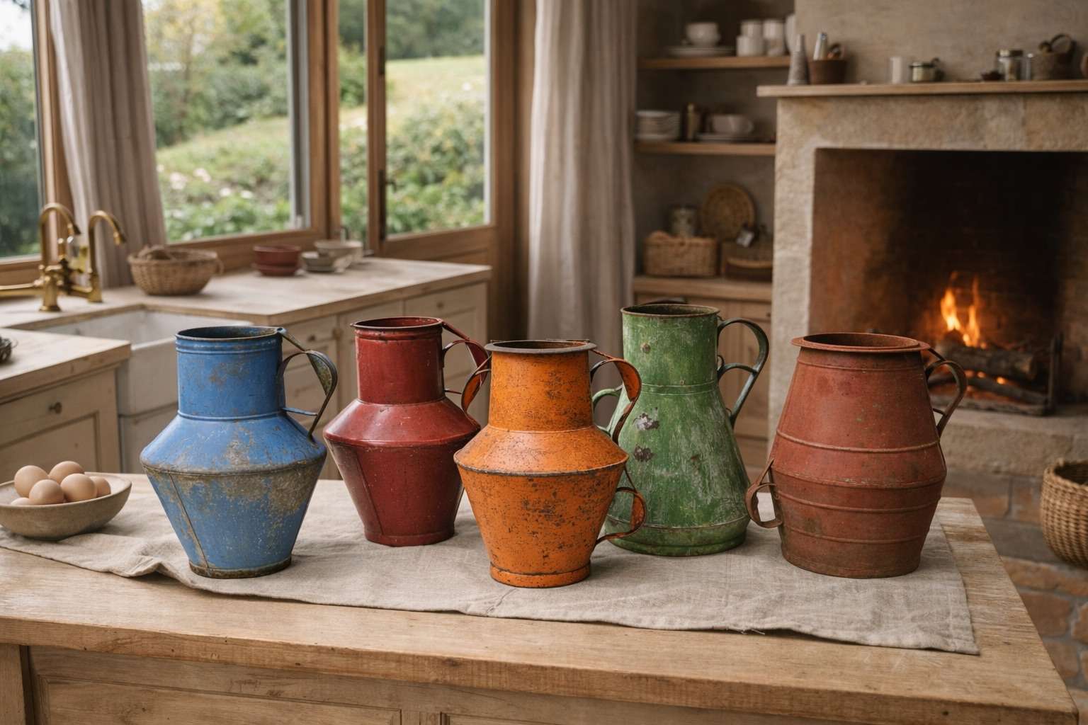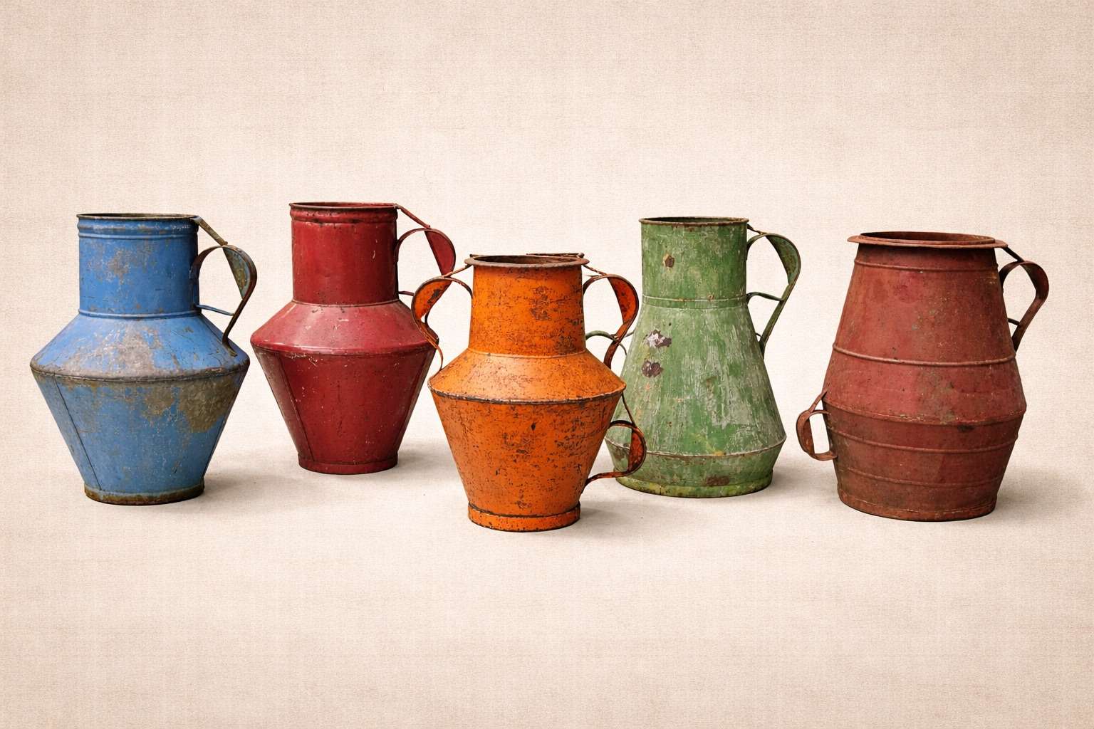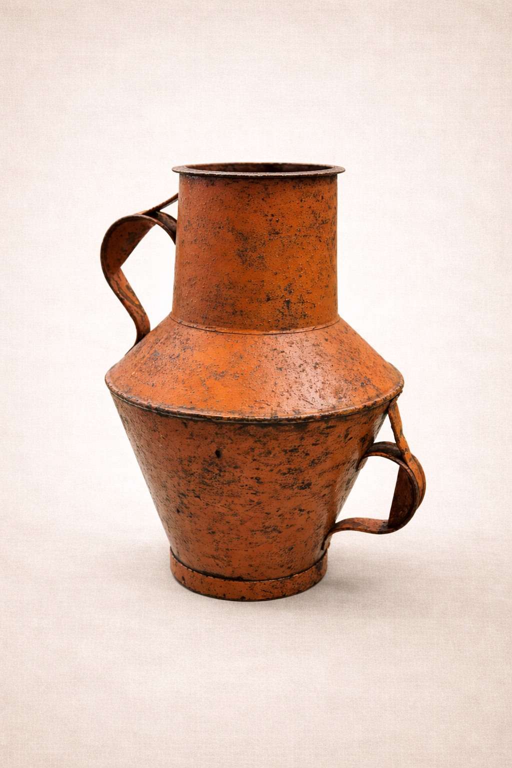 Aceitera portuguesa antigua de metal con su pátina original. Es una pieza sencilla y honesta, pensada en su origen para el uso cotidiano, y precisamente por eso tiene tanta personalidad.