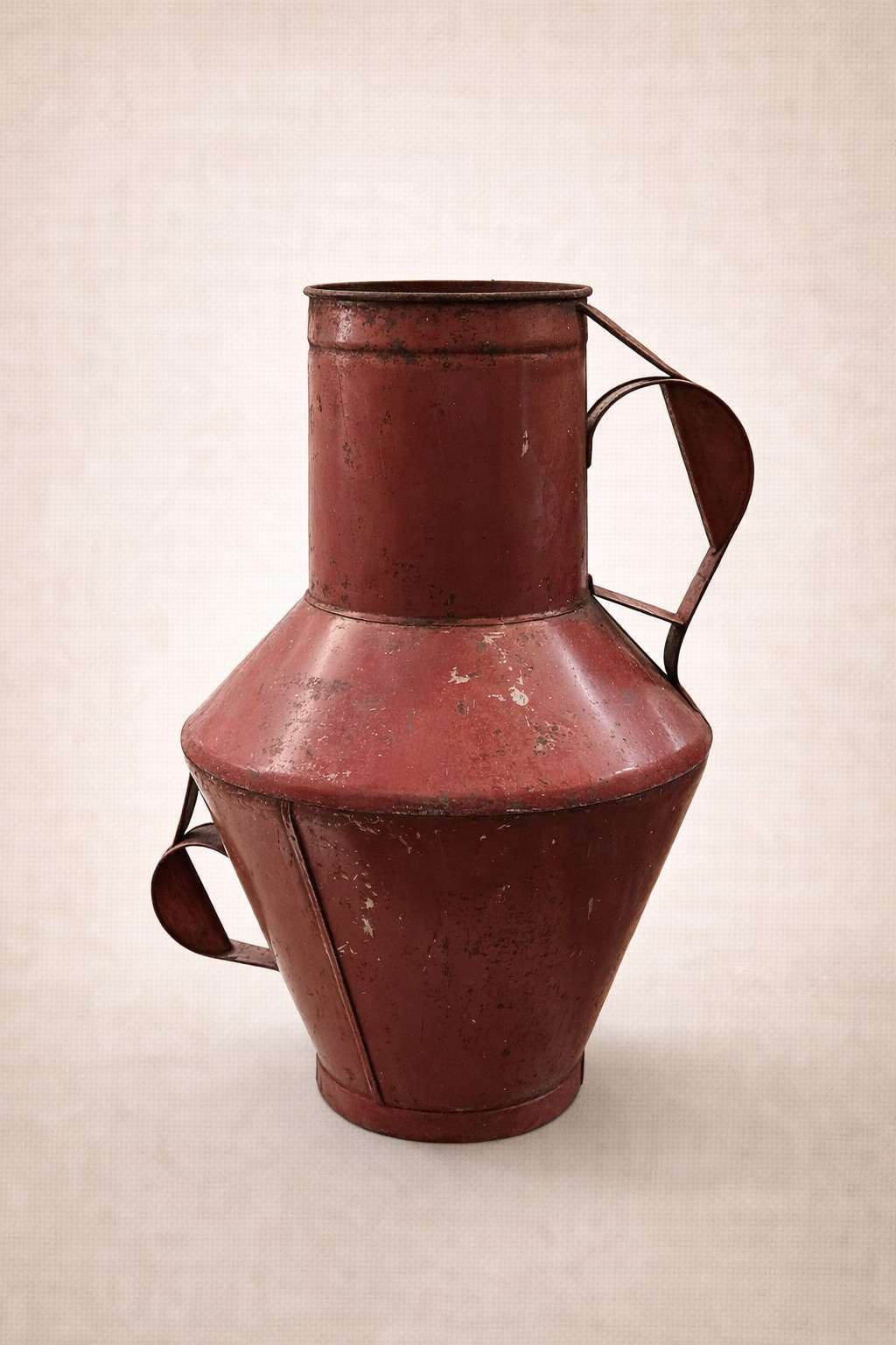 Aceitera portuguesa antigua de metal con su pátina original, que le da ese tono rojizo tan característico. Es una pieza sencilla y honesta, pensada en su origen para el uso cotidiano, y precisamente por eso tiene tanta personalidad.