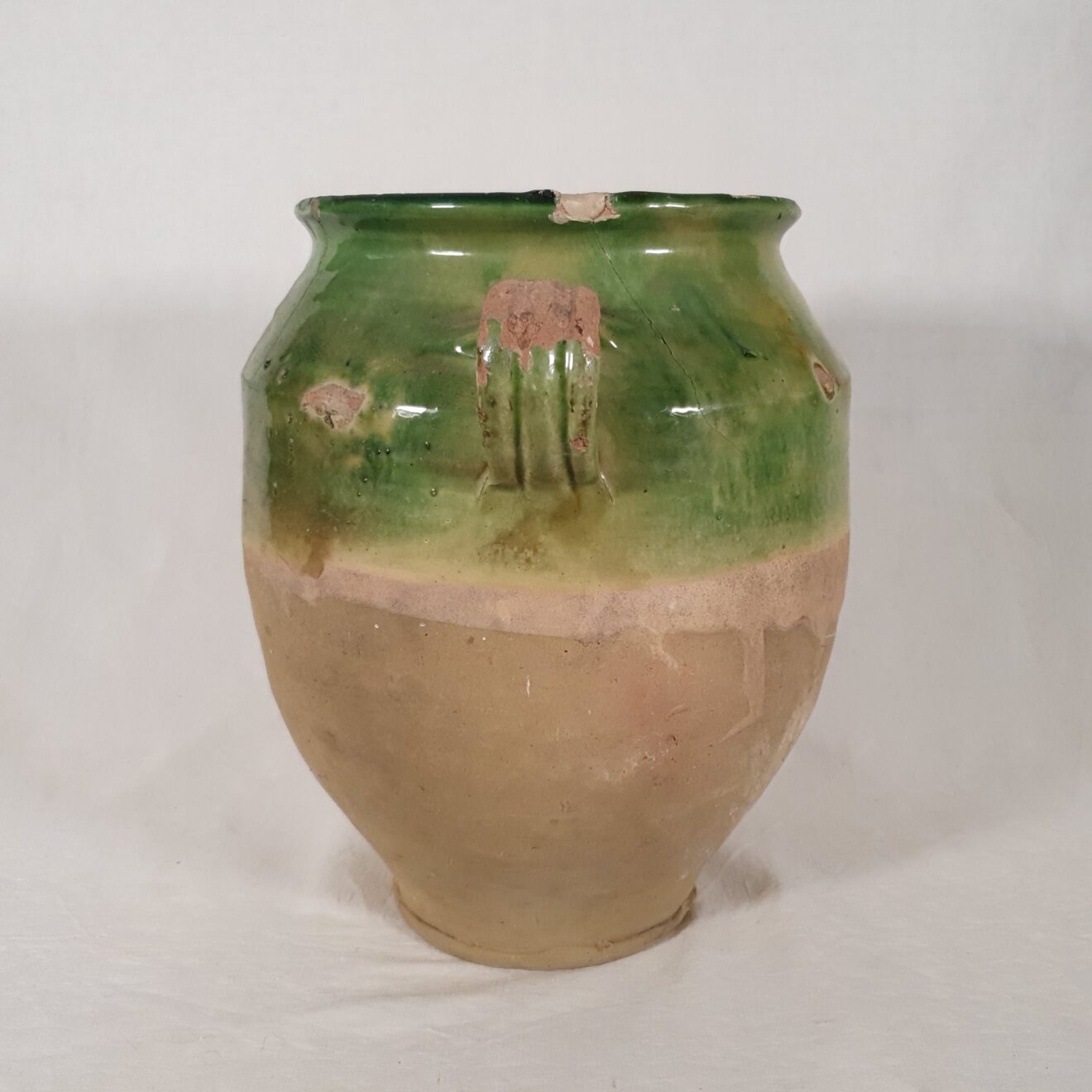 Descripción: Utilizadas en el S. XIX en el sur de Francia para la conservación del pato o ganso. La mitad inferior se dejaba sin esmaltar ya que se medio enterraban en el suelo para mantener el contenido fresco y seco.