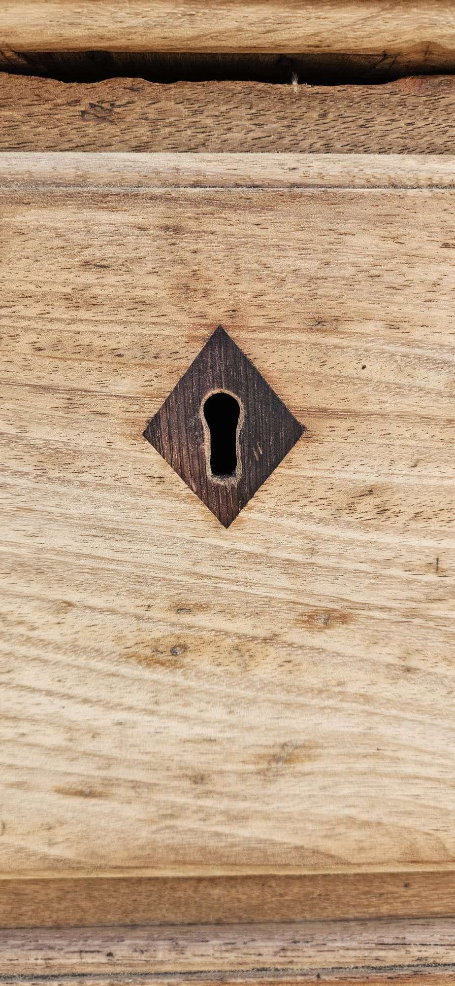 Presenta una estructura equilibrada con seis cajones —tres superiores más pequeños y tre amplios inferiores—, tiradores redondos y bocallaves originales que aportan carácter. Las patas torneadas elevan el conjunto con ligereza, manteniendo un aire rústico y elegante.