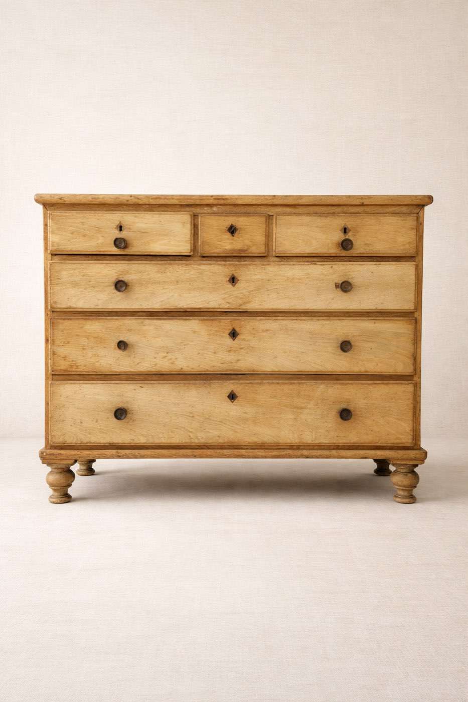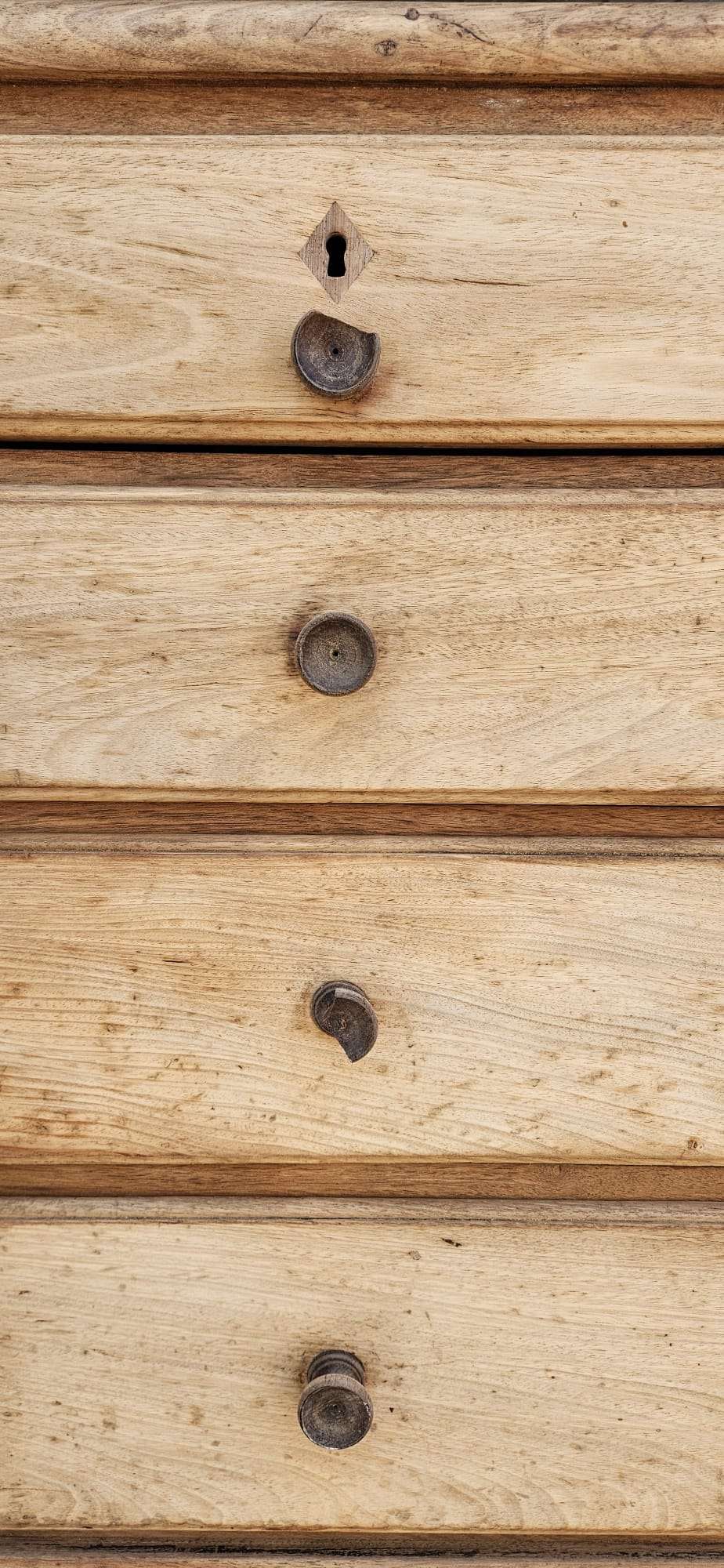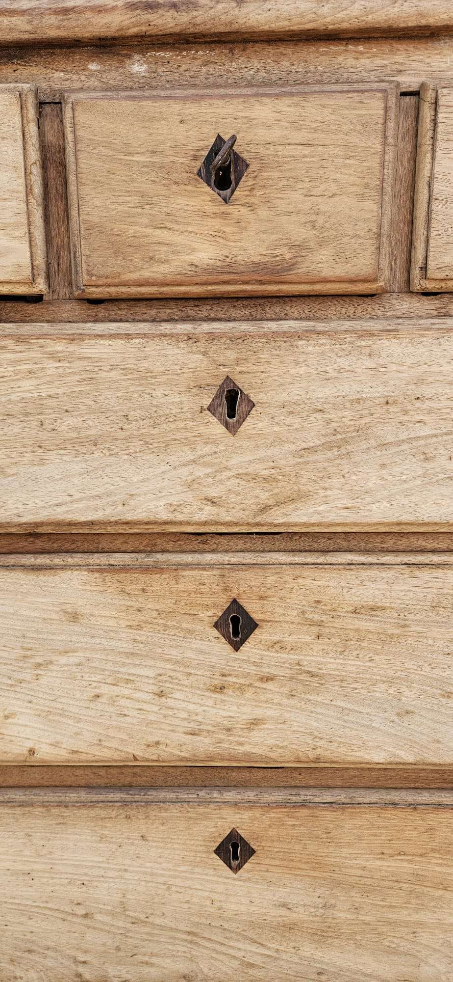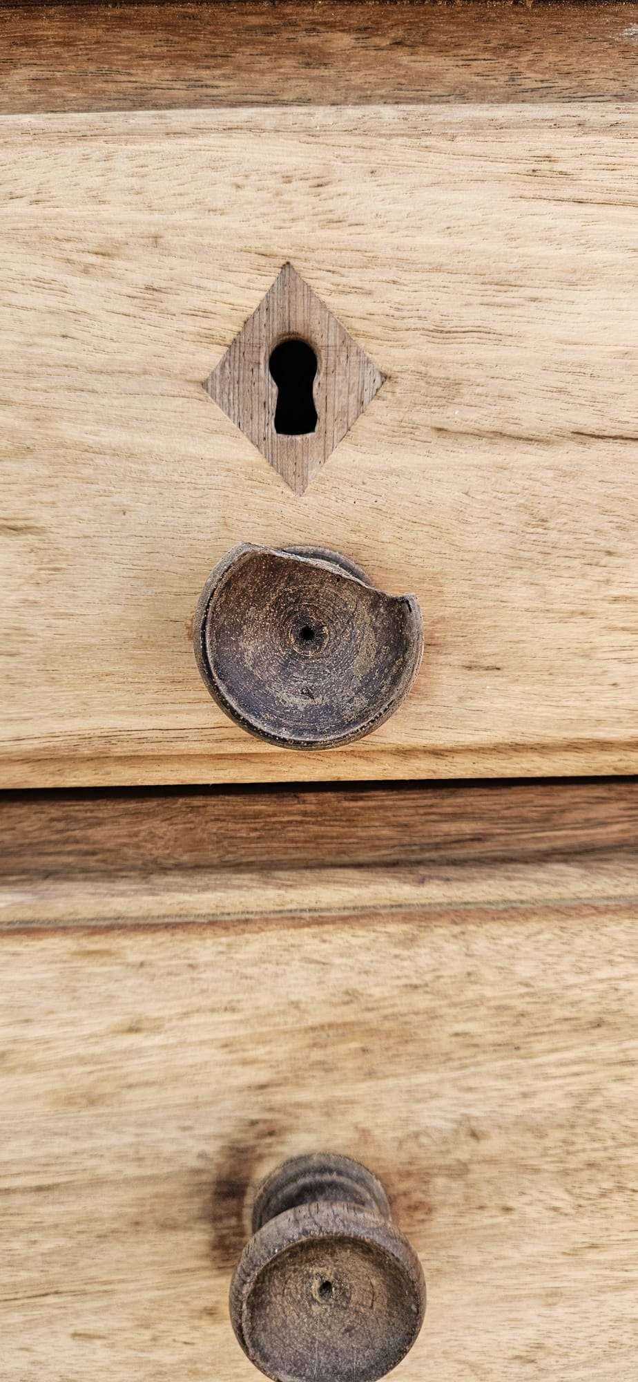 Cómoda antigua de madera maciza con una pátina cálida y natural que resalta la veta original de la pieza.