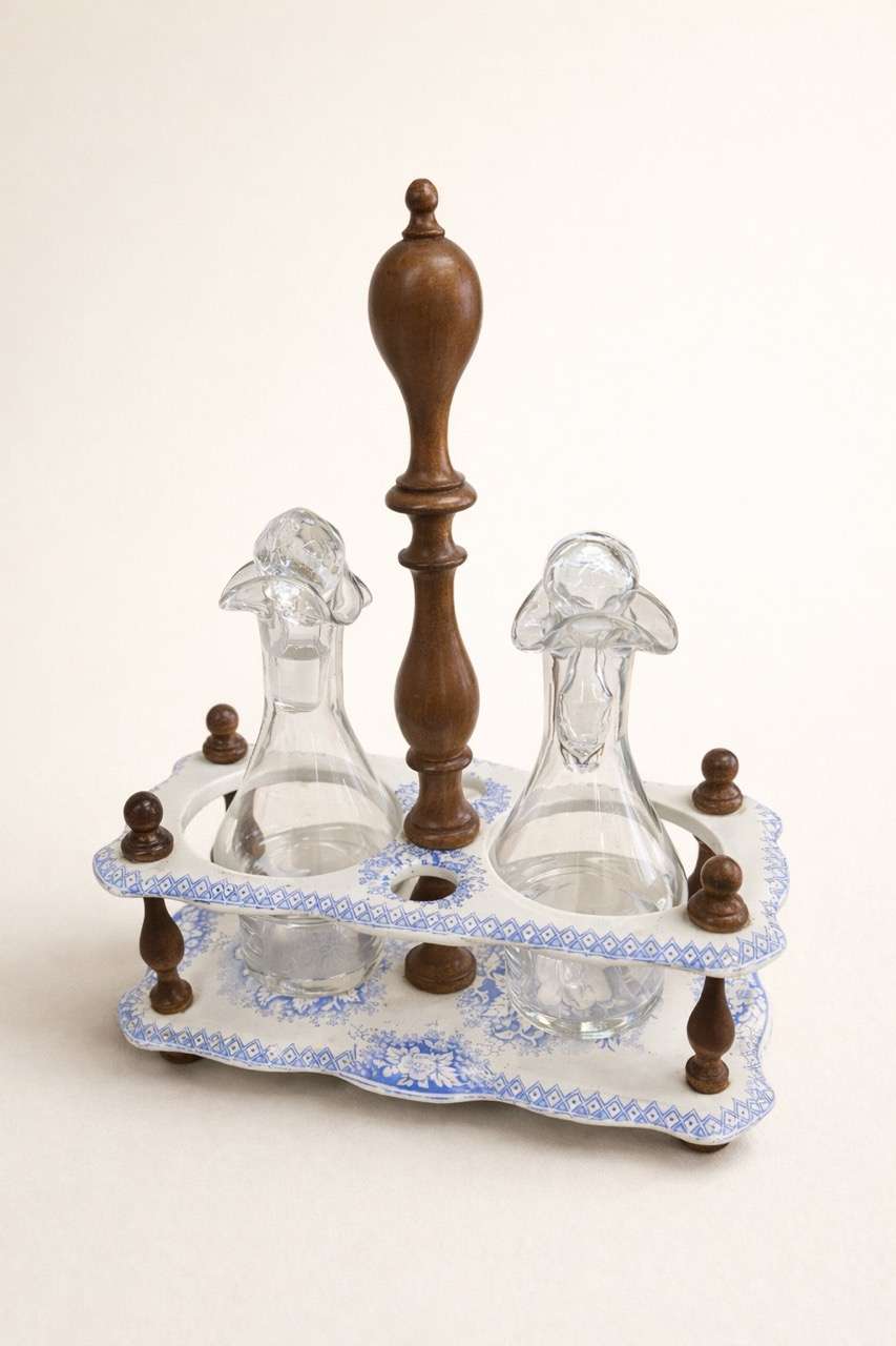 Convoy antiguo de porcelana decorada en azul con estructura de madera y dos vinajeras de cristal soplado. Una pieza práctica y decorativa para la mesa, perfecta para servir aceite y vinagre con un toque especial.