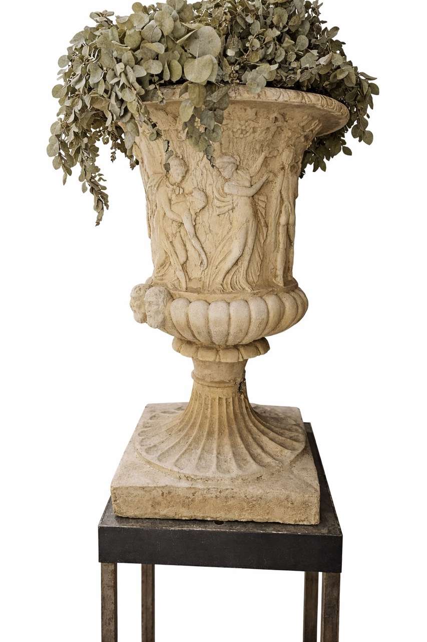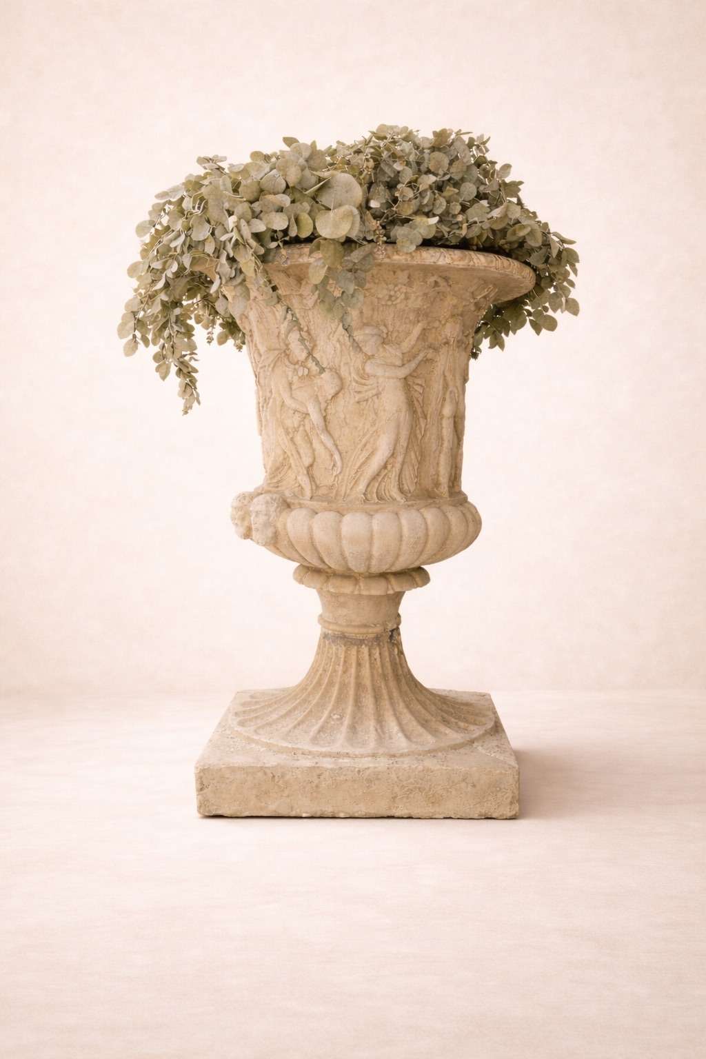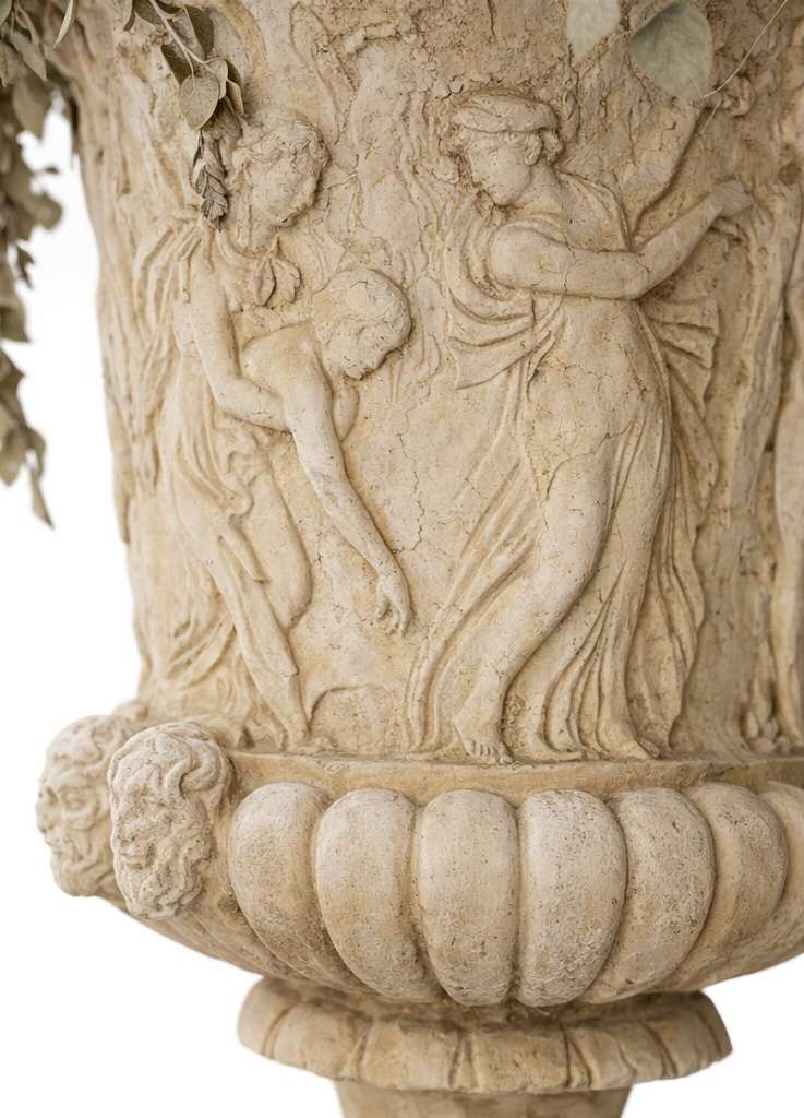 Cuerpo principal: presenta relieves con figuras humanas femeninas en movimiento, de estilo clásico, posiblemente inspiradas en escenas mitológicas o alegóricas. Las figuras parecen danzar o interactuar entre sí.
