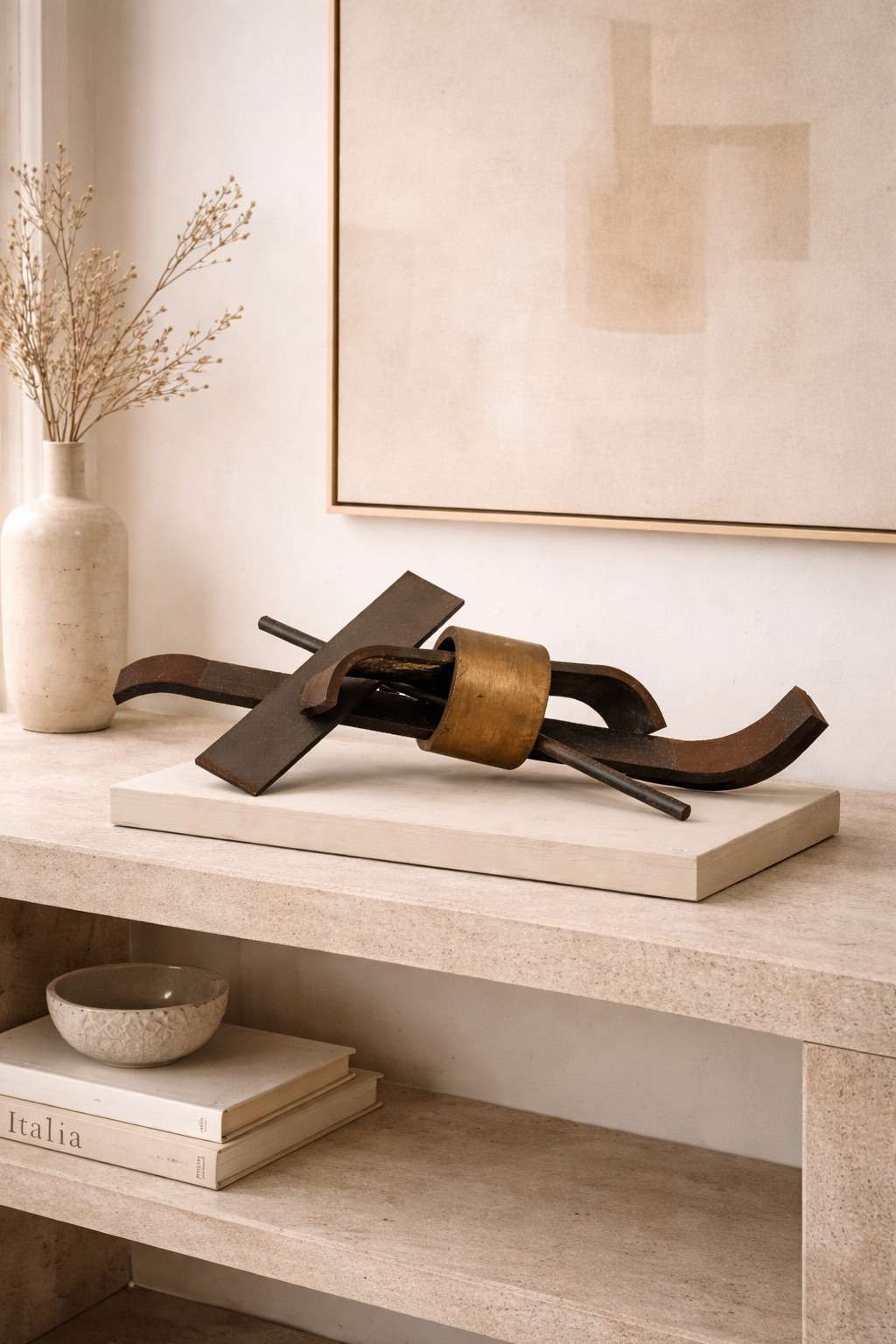 Una obra de carácter contemporáneo con presencia y textura, ideal para colocar sobre una consola, aparador o mesa baja, donde pueda apreciarse su juego de volúmenes y materiales.