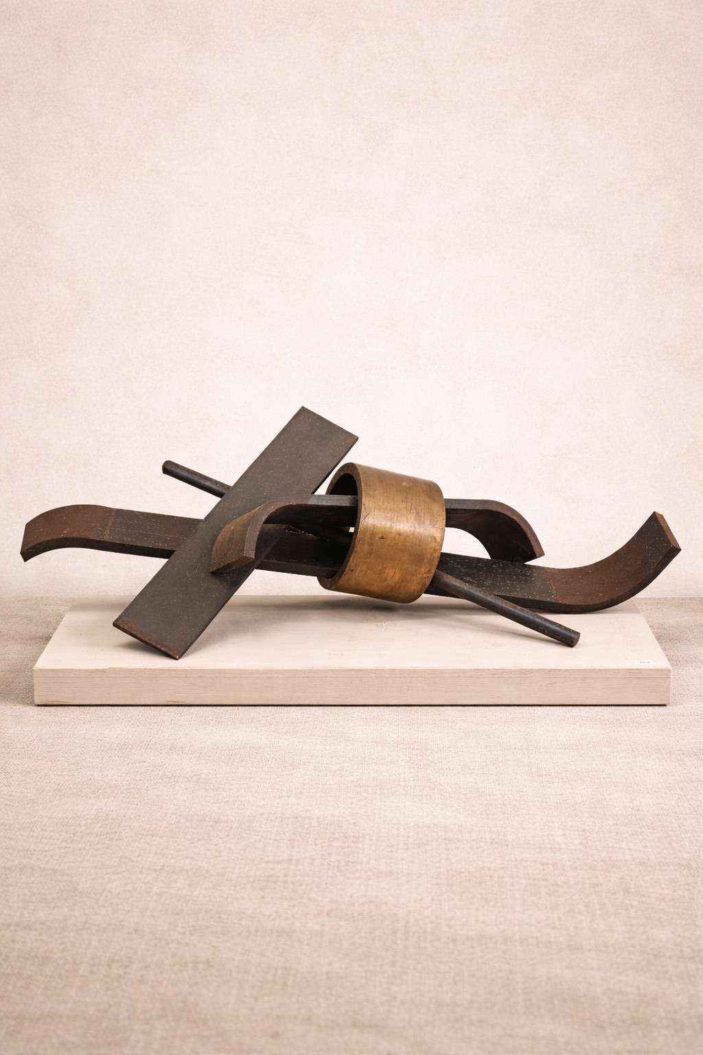 Escultura “Aro de Bronce” del artista Jorge de la Fuente, realizada en hierro con un aro central en tono bronce. La pieza combina formas geométricas y líneas curvas creando una composición equilibrada y muy escultórica.