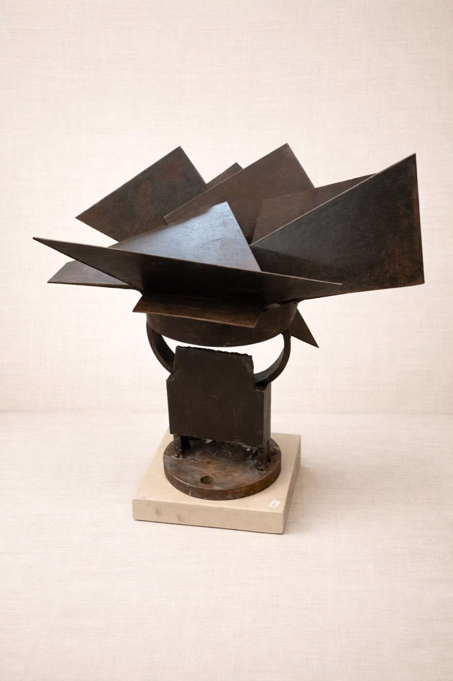 Escultura de hierro con composición abstracta formada por planos geométricos superpuestos que generan un juego dinámico de volúmenes y ángulos. La pieza se eleva sobre una base que aporta estabilidad y contraste con la estructura metálica, resaltando la fuerza del material y su pátina natural.