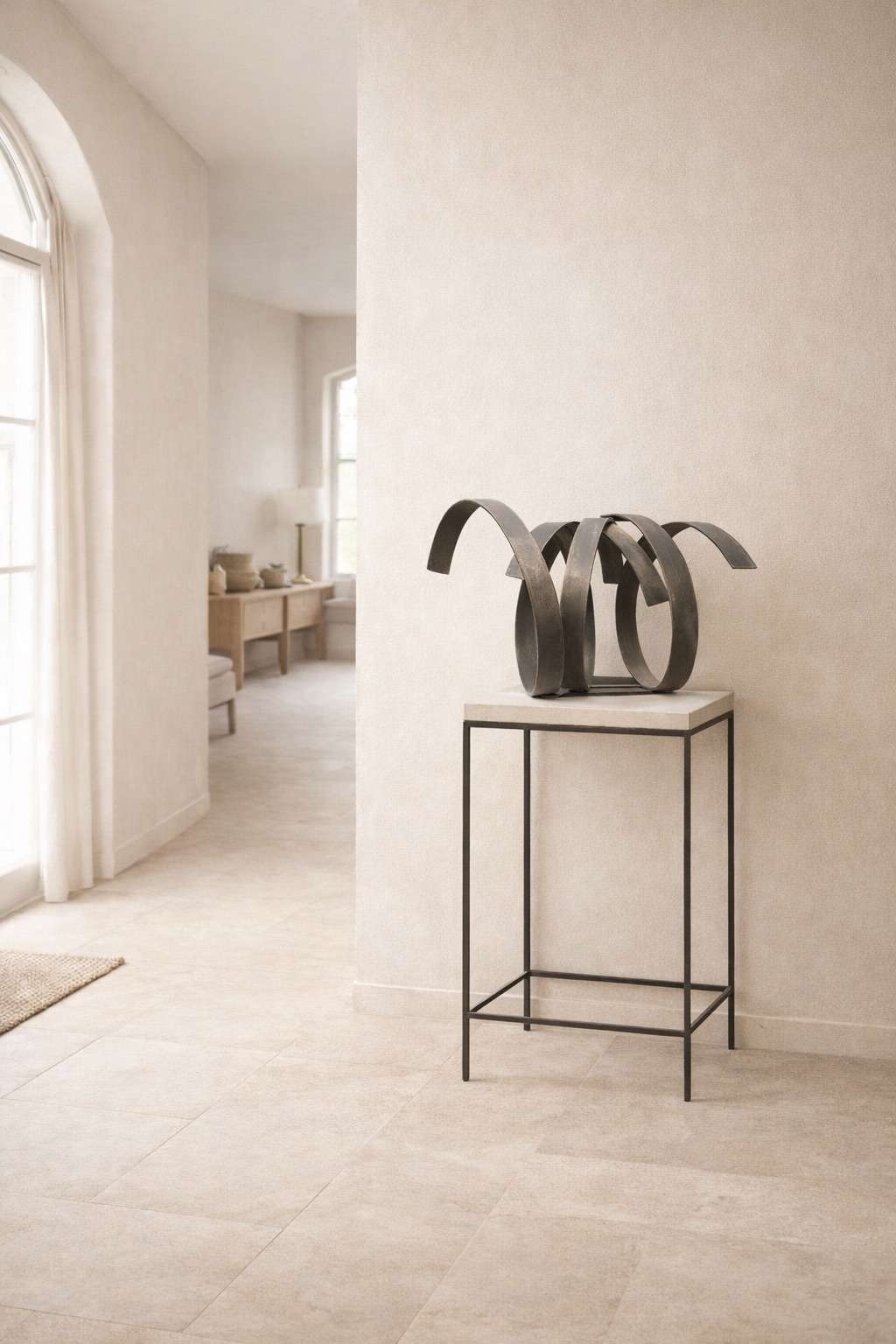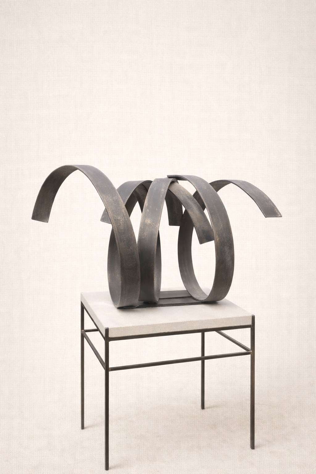 Escultura abstracta en hierro de Jorge de la Fuente Arteaga formada por varias bandas curvas que se entrelazan creando un movimiento fluido, evocando el ritmo del mar y el vaivén de las olas. La pieza combina fuerza y ligereza, jugando con los vacíos y el equilibrio de las formas.