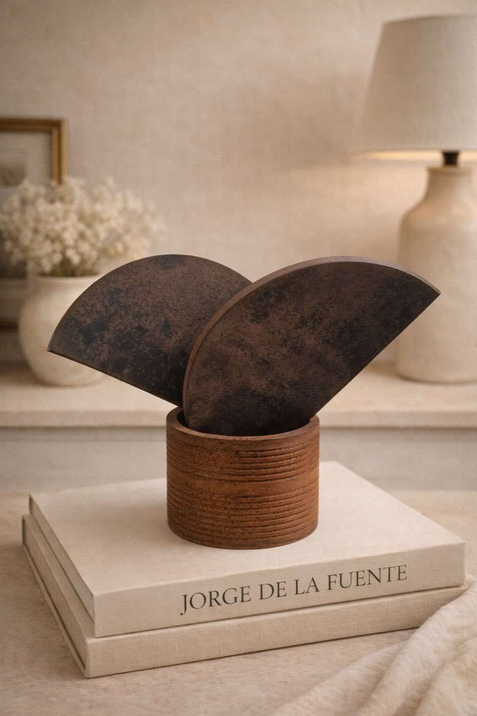 Escultura abstracta en hierro titulada Pimpilimpausa, obra de Jorge de la Fuente. La pieza combina dos planos curvos que emergen desde una base cilíndrica, creando un juego elegante de equilibrio, movimiento y volumen. La pátina natural del metal aporta profundidad y carácter, mientras que la composición minimalista resalta la fuerza del gesto escultórico.
