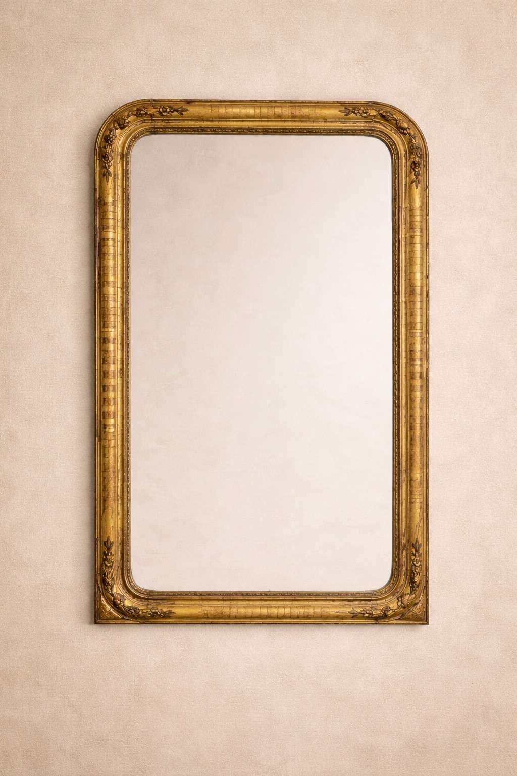 Espejo español de finales del siglo XIX, con marco de madera tallado y dorado al pan de oro. Tiene las esquinas suavemente redondeadas y pequeños motivos decorativos en las esquinas. El dorado conserva una bonita pátina del tiempo, que le da calidez y hace que encaje muy bien tanto en interiores clásicos como en espacios más contemporáneos.