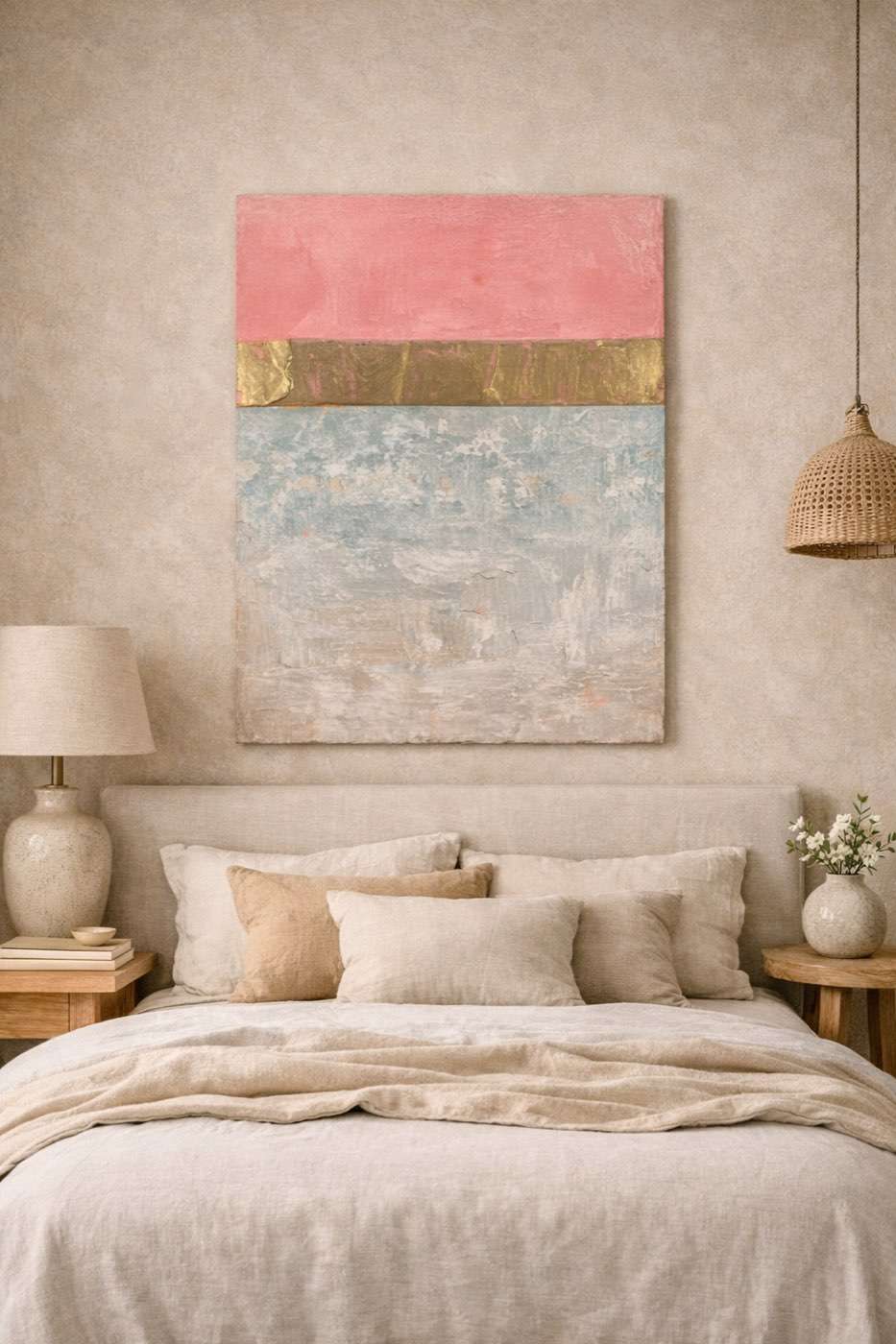 El cuadro combina un campo rosa en la parte superior, una franja de pan de oro que aporta luz, y una base de tonos grises y azulados con textura. Una pieza elegante y serena, donde el color y la materia dialogan con mucha sutileza.