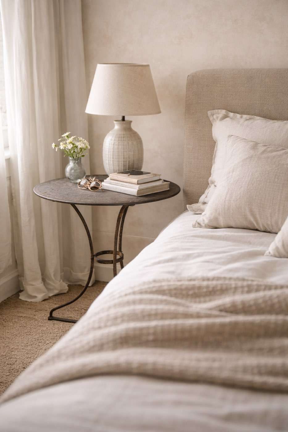 Es una pieza pequeña pero con mucha personalidad. Funciona muy bien como mesita de noche, junto a un sillón o en un rincón del salón. Su estructura fina la hace visualmente ligera y fácil de integrar en espacios neutros, donde el hierro envejecido aporta contraste y textura.