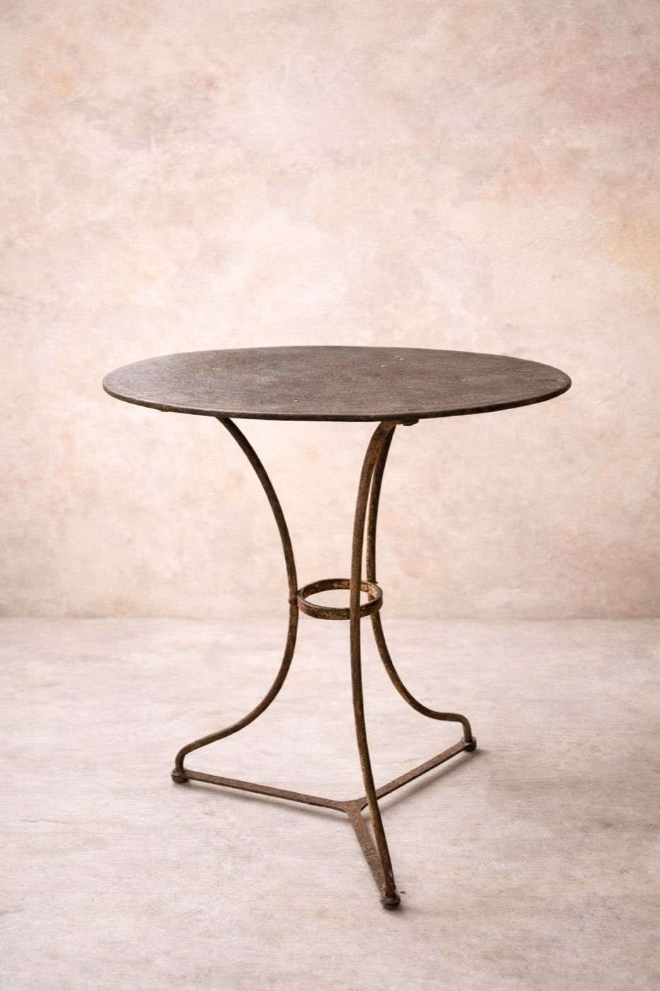Mesita auxiliar de hierro con sobre circular y estructura ligera de tres patas curvadas. Conserva su pátina original, con ese desgaste natural que le da carácter y autenticidad sin perder estabilidad.