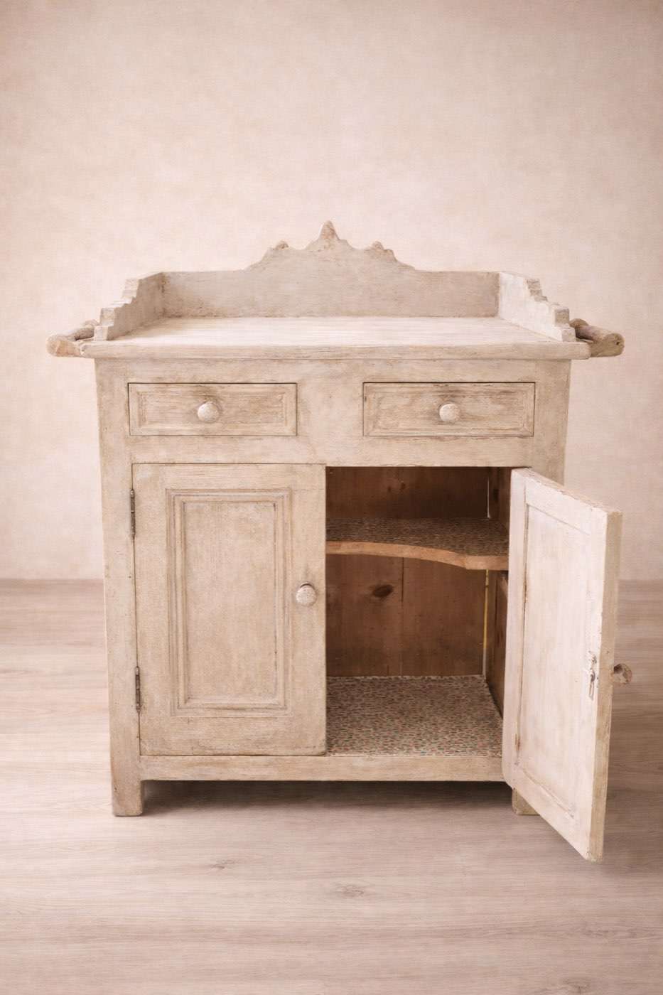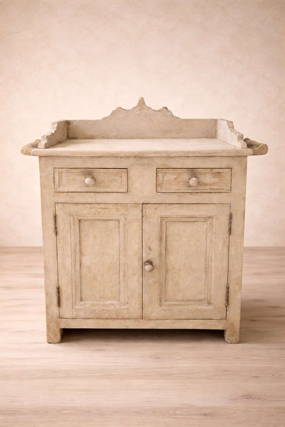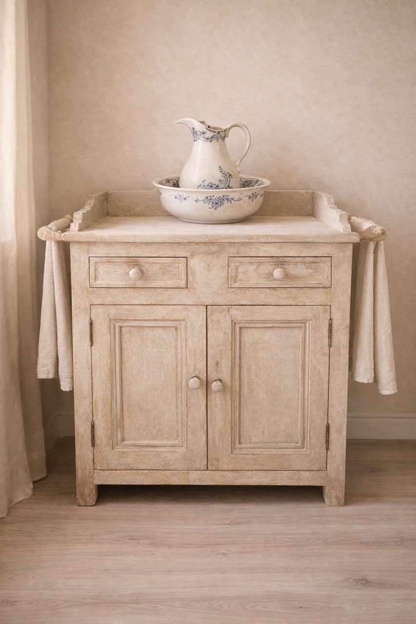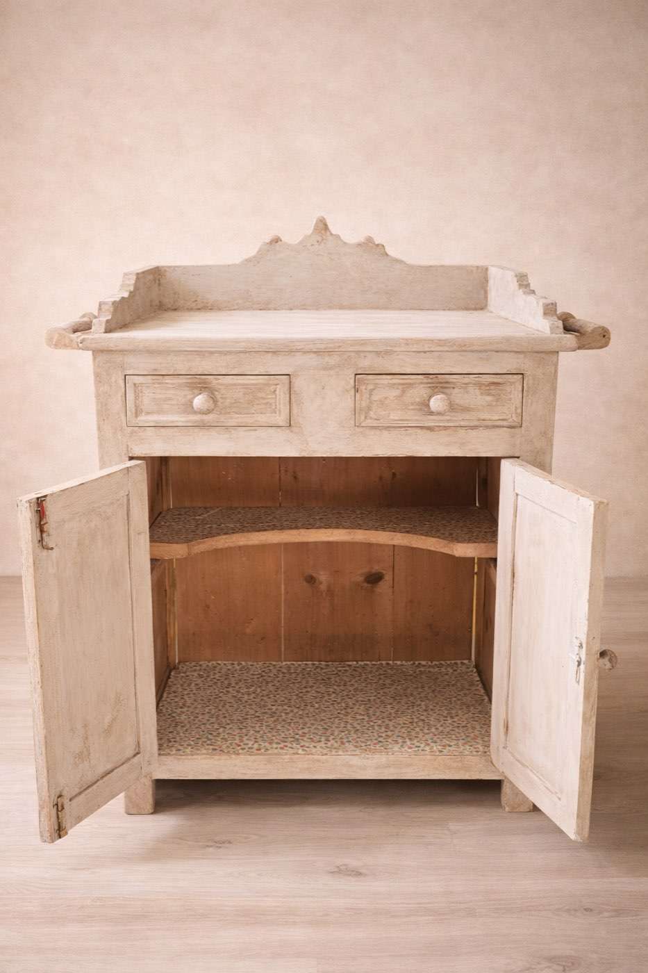 Mueble lavabo antiguo de madera maciza con acabado decapado en tono marfil envejecido. Conserva su estructura original con dos cajones superiores, puertas inferiores y soportes laterales para toallas, un detalle característico de los antiguos lavabos de dormitorio.