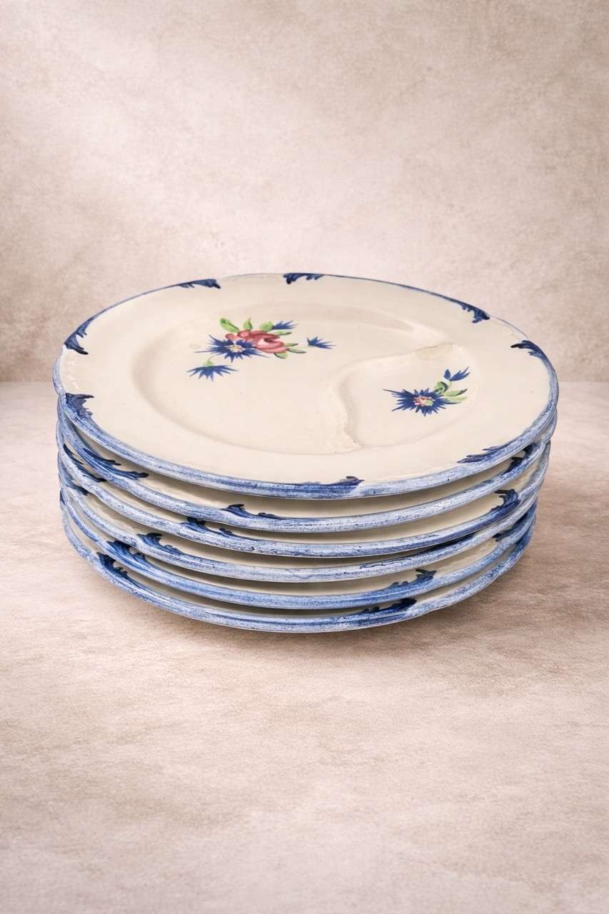 Conjunto de seis platos para espárragos en loza francesa, decorados a mano con delicados motivos florales en tonos azules, verdes y rosa sobre fondo marfil. El ala presenta un acabado en azul que enmarca la pieza y realza su carácter artesanal.