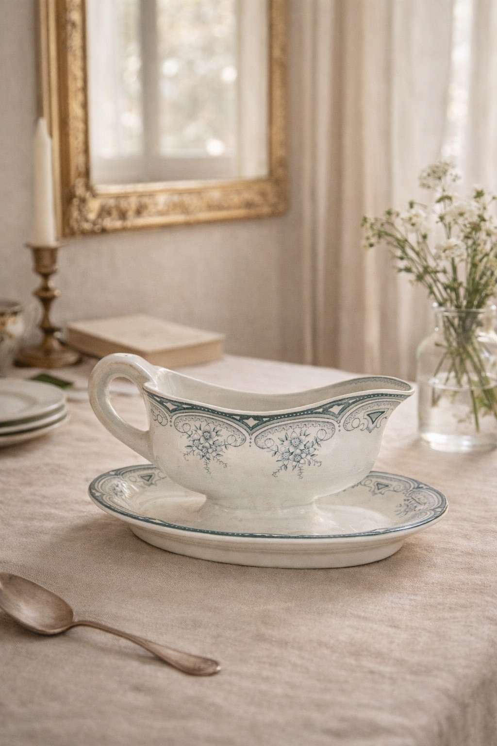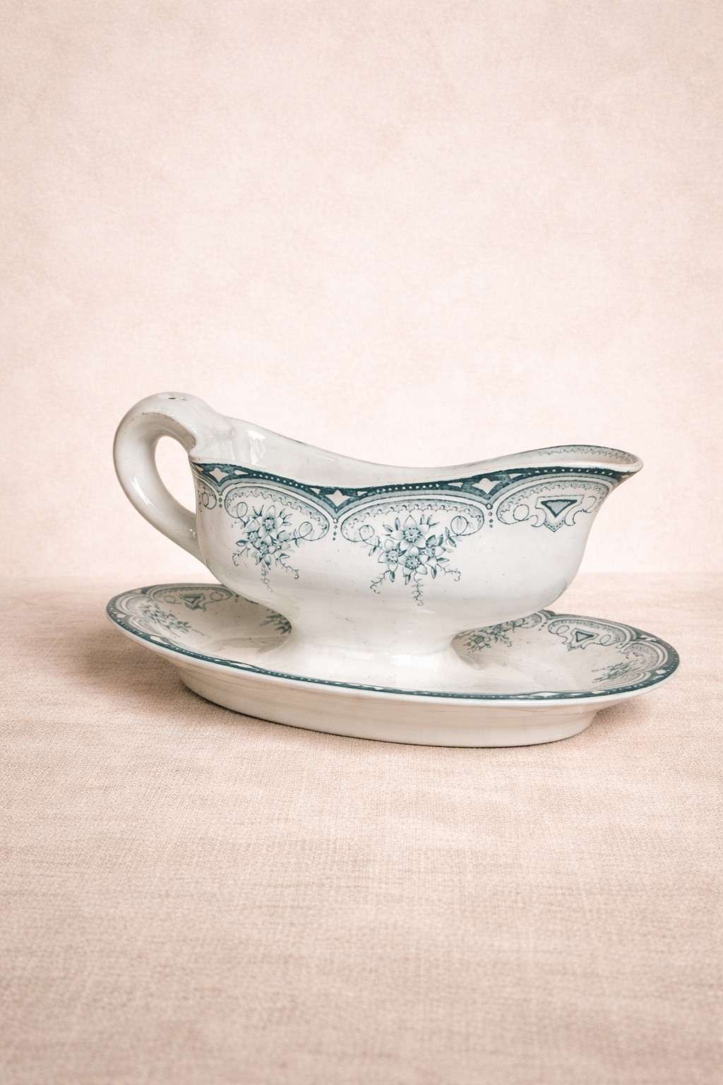 Salsera de loza francesa con plato, decorada con delicados motivos florales y cenefas ornamentales en tono verde. La pieza presenta asa lateral y vertedor, acompañada de su plato a juego. Su diseño elegante y clásico la convierte en un elemento ideal para mesa tradicional o colección de vajilla antigua.