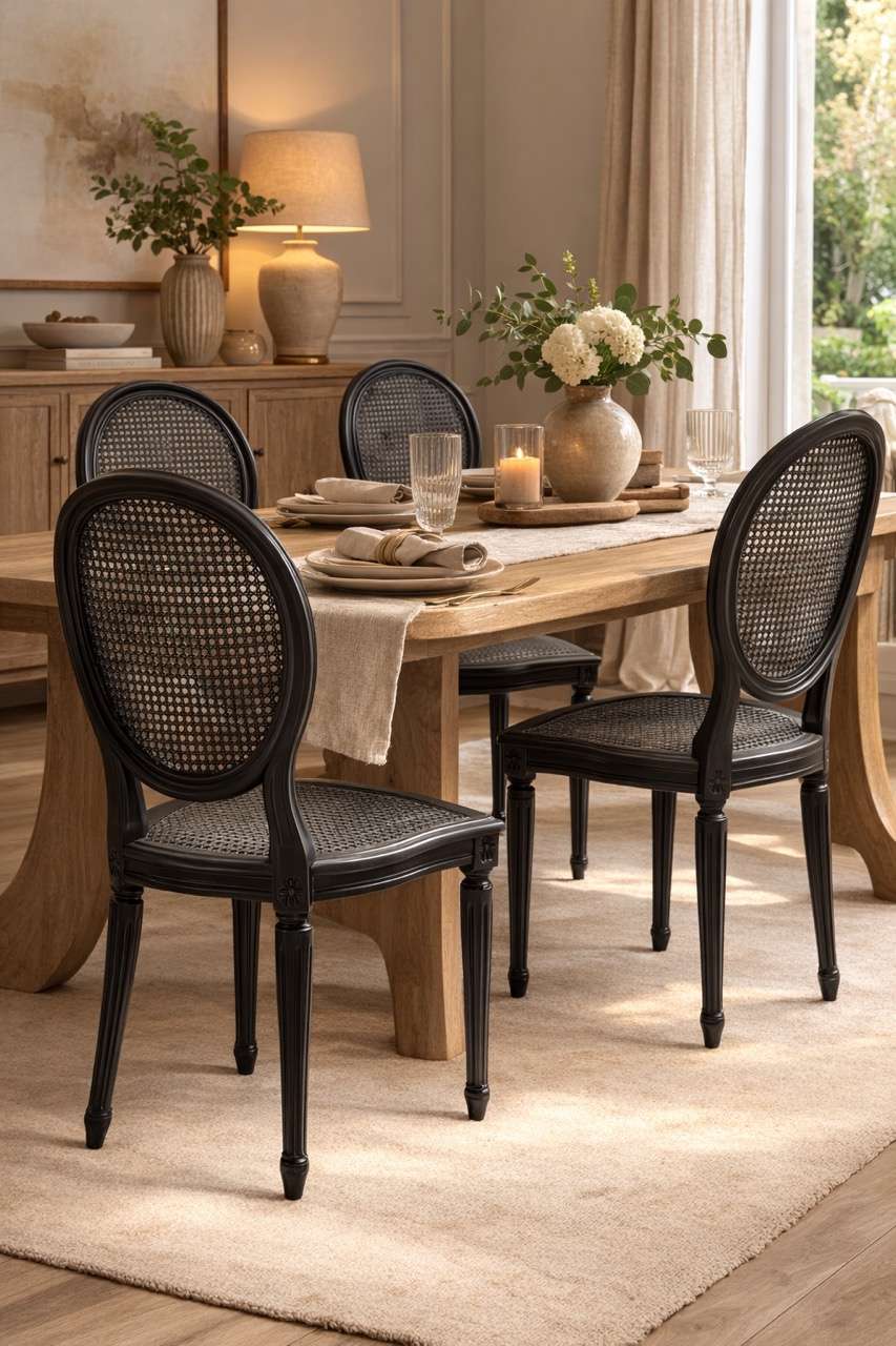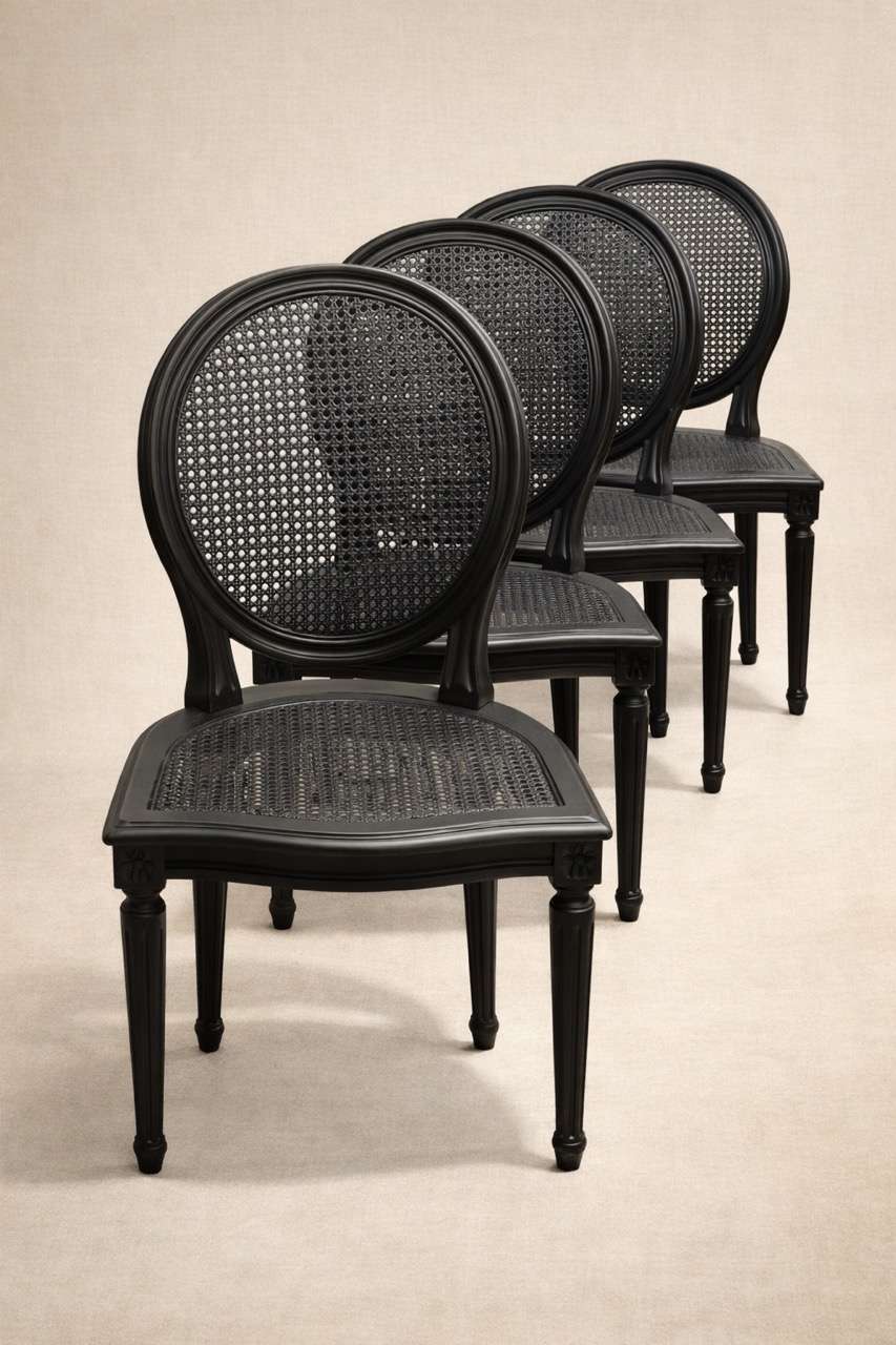 Conjunto de seis sillas de líneas clásicas con respaldo ovalado y asiento de rejilla. Fabricadas en madera lacada en negro, mantienen una silueta elegante y equilibrada, con patas acanaladas y estructura ligera. La rejilla aporta textura y ligereza visual, contrastando con el acabado oscuro de la madera.