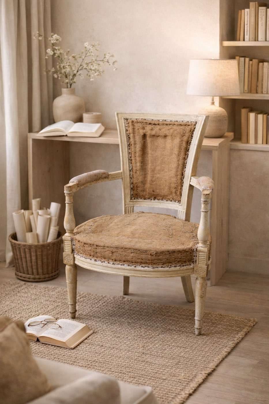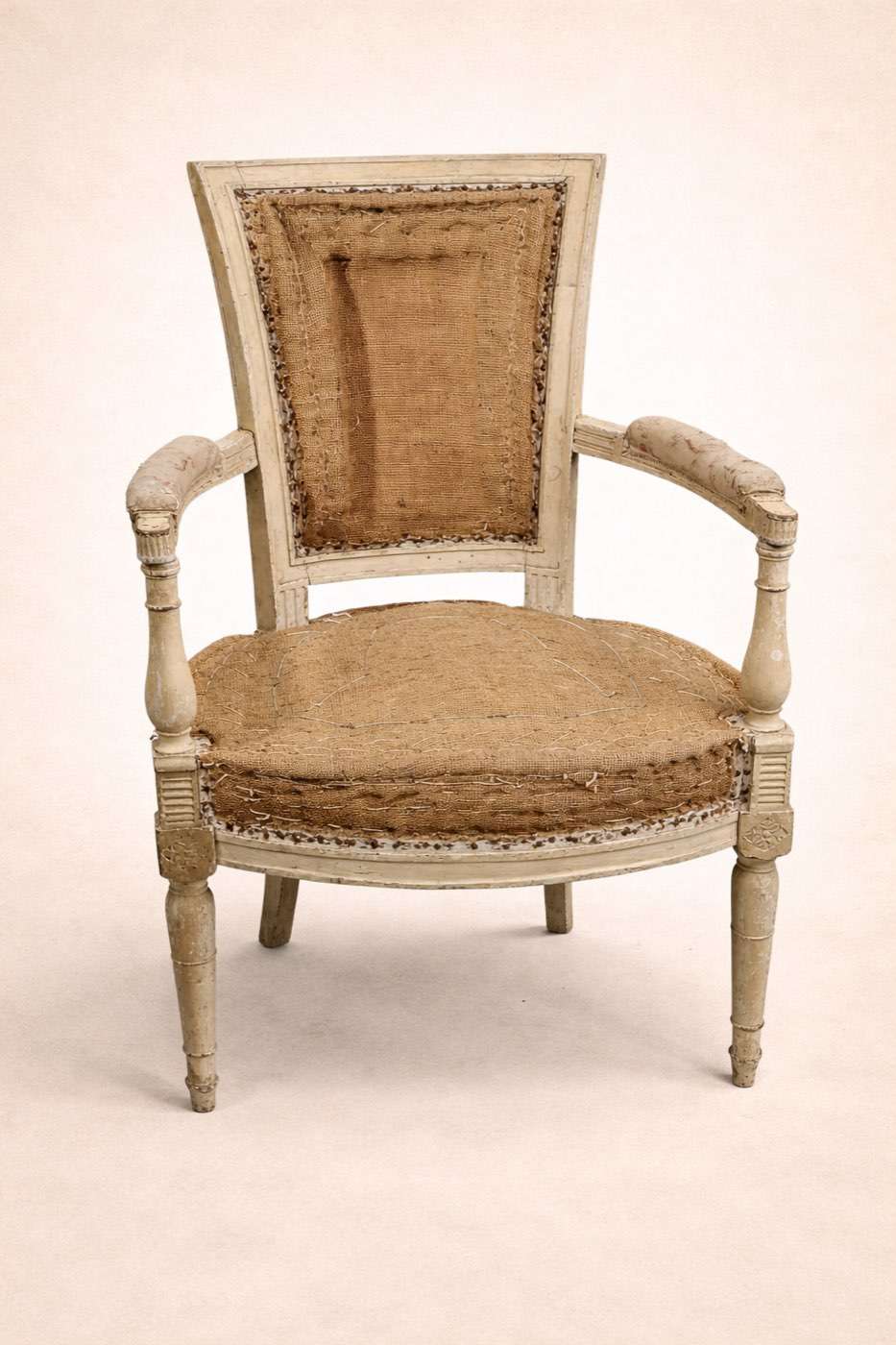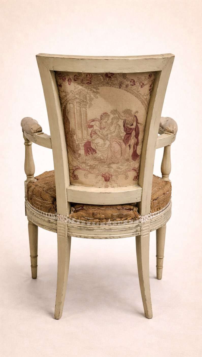 Sillón antiguo estilo Luis XVI decapado con tapicería trasera original