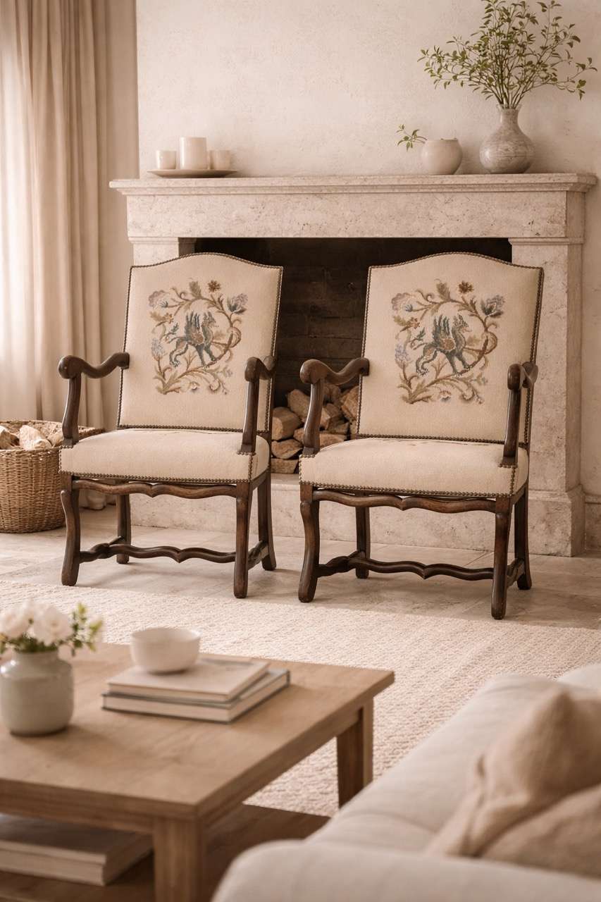 Pareja de sillones antiguos estilo Os de Mouton con tapiz bordado.