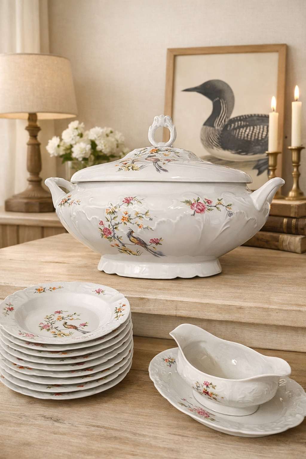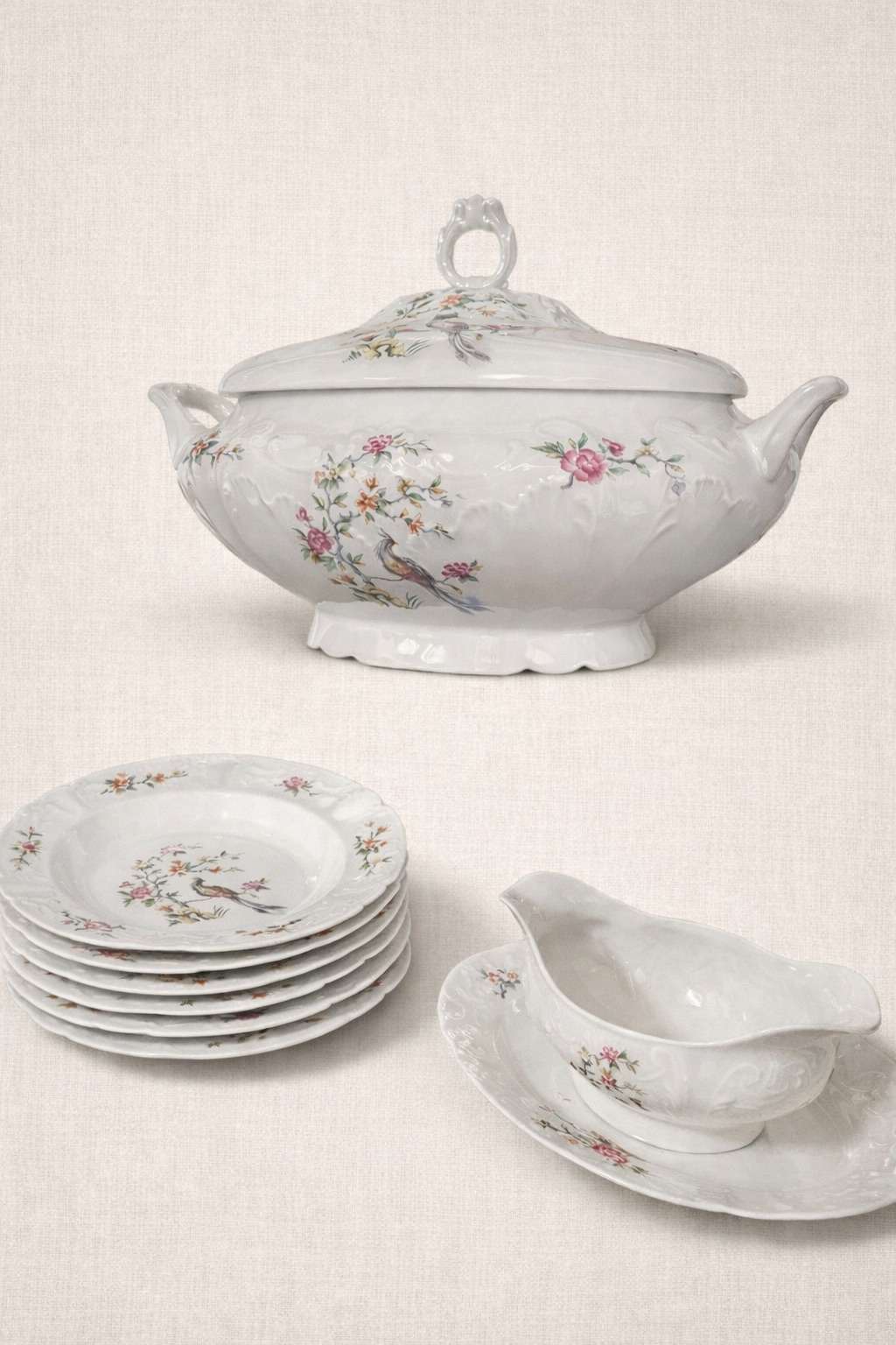 Bonito conjunto de vajilla de porcelana blanca con delicada decoración floral y pequeños pájaros. Incluye sopera con tapa, salsera con plato y varios platos hondos a juego.